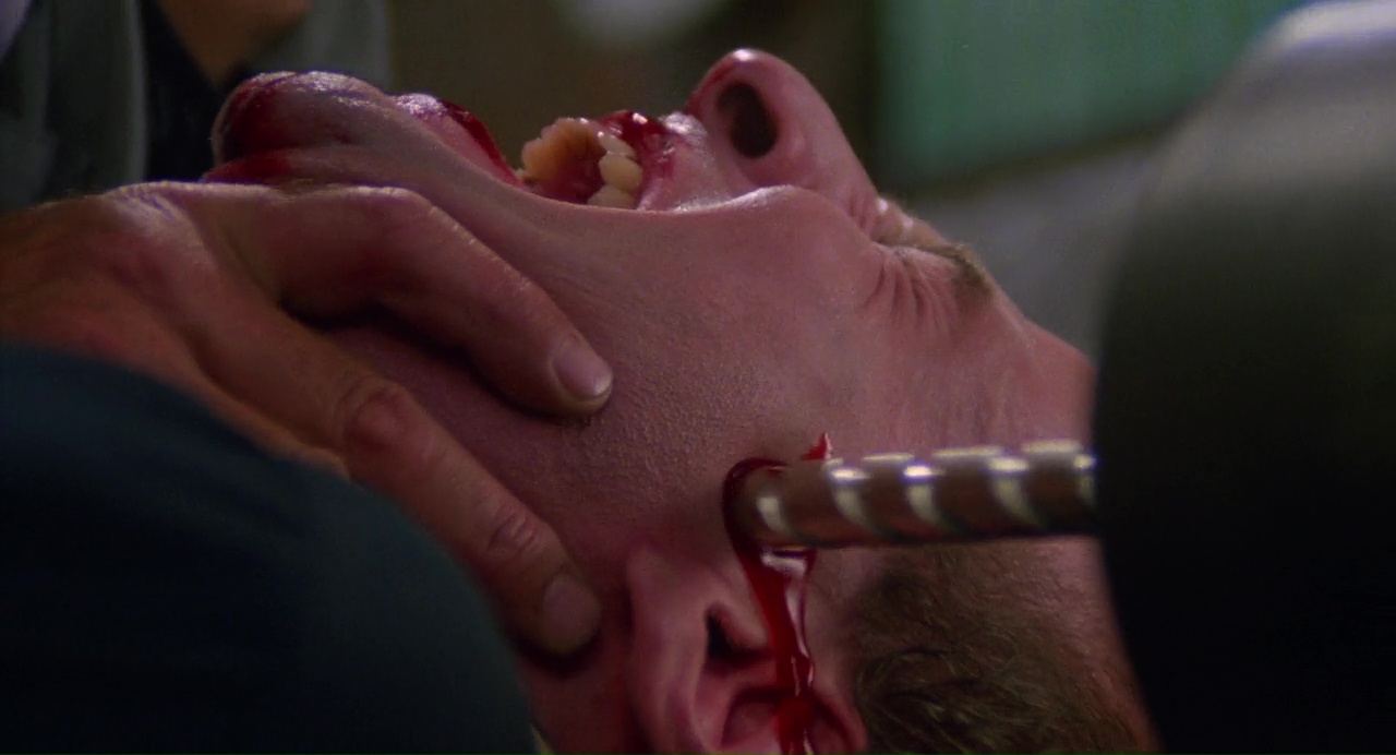 a power drill through the head in the films show stopping moment. His look of