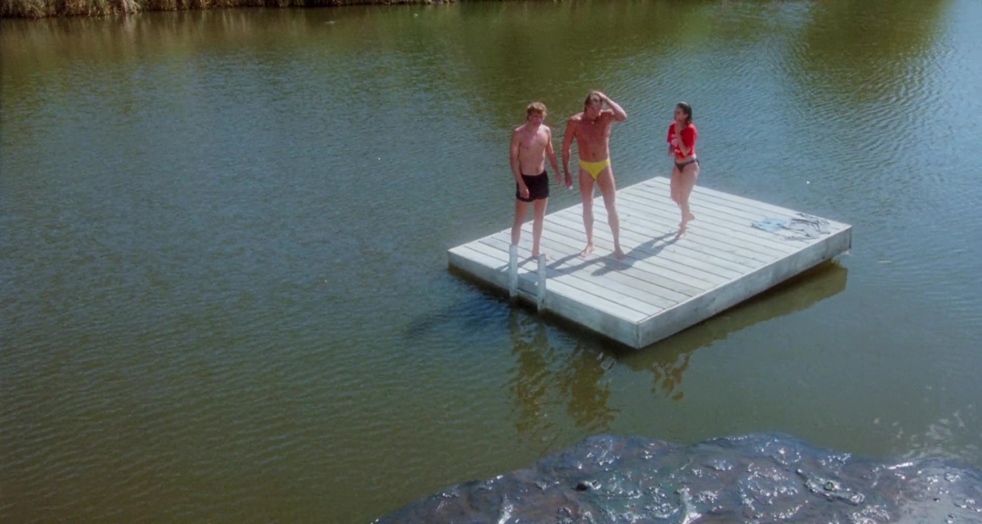 lake for some swimming and fun. Once there they swim out to a raft in the