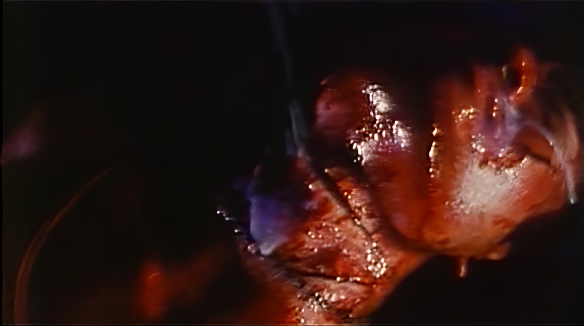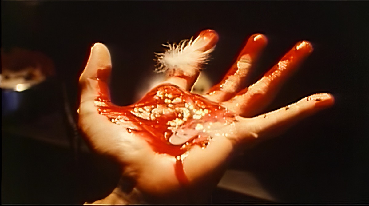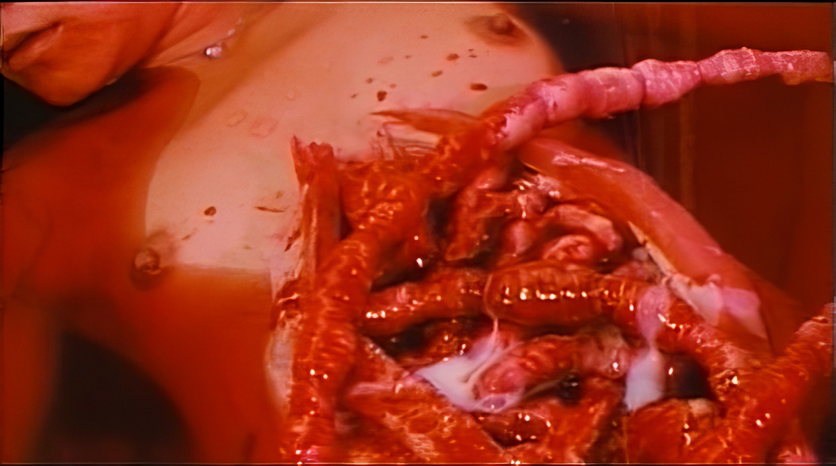 squirted into the wound. A stomach is sliced open and the intestines spill out