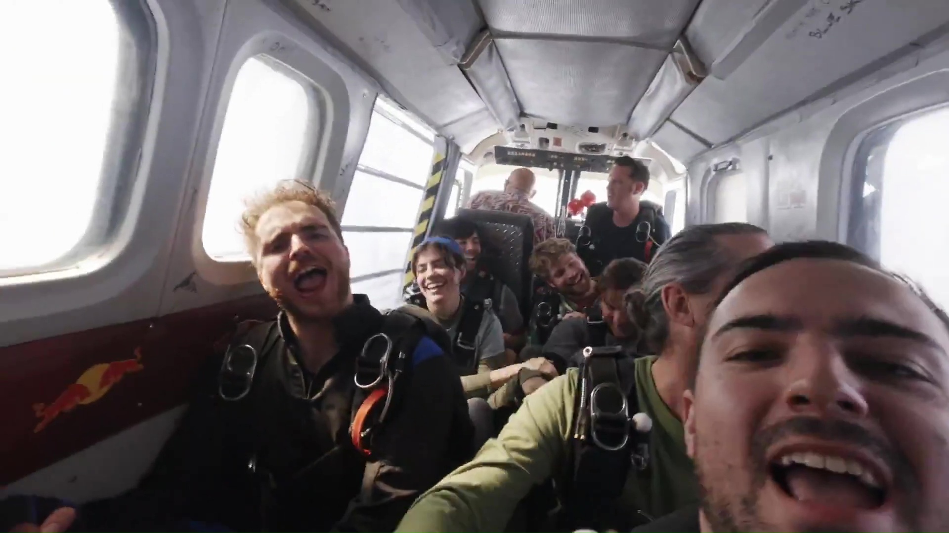 celebrating their friends 30th birthday by going skydiving. They see several